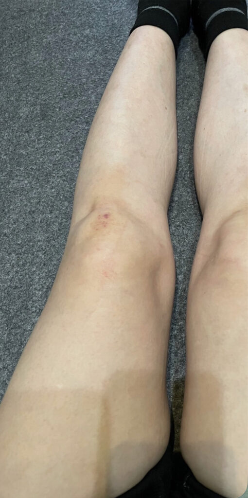 膝の前面に腫れが出現し、曲げることが困難な状態になっていました。
