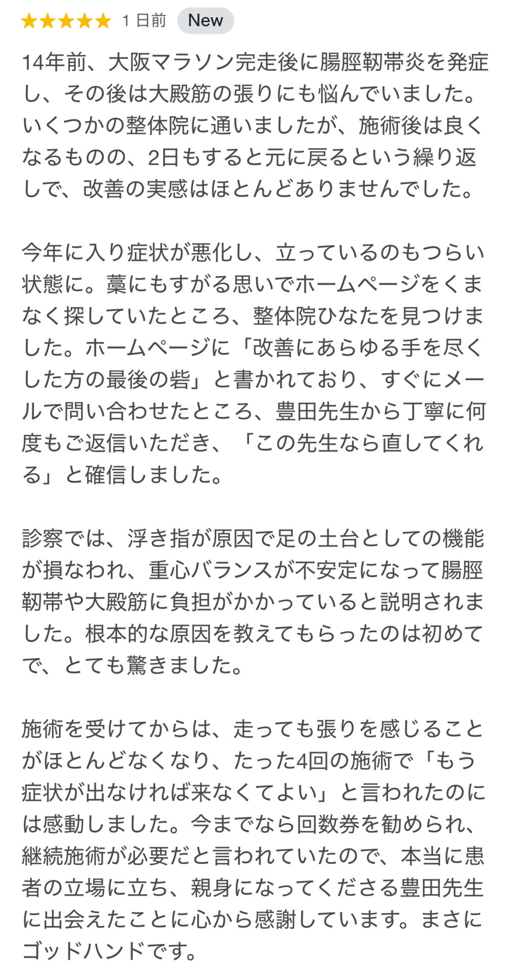 14年前、大阪マラソン完走後に腸脛靭帯炎を発症し、その後は大殿筋の張りにも悩まれていたランナーさんのご感想です。